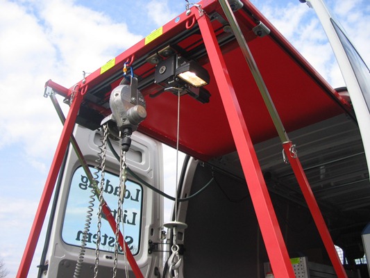 A roller blind is available as an option for almost every vehicle with a high roof. If it is needed, the roller blind can be moved outwards by simply moving two catch hooks on the slide. This protects you from the sun and rain showers. A highlight is the worklight mounted on the slide, which can also illuminate work in the shaft (optionally available). Furthermore, every Loading-Lift system can be equipped with a lateral movement of the electric winch (electric or manual).
