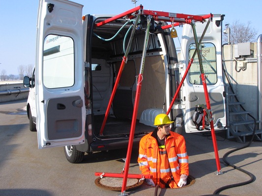 When working in the shaft, it is possible to replace pumps and slide valves while at the same time securing people against falling with the aid of a Rollgliss or fall arrester on the Loading-Lift. The loading lift is PPE-tested for personal safety with 14KN for 3 persons.